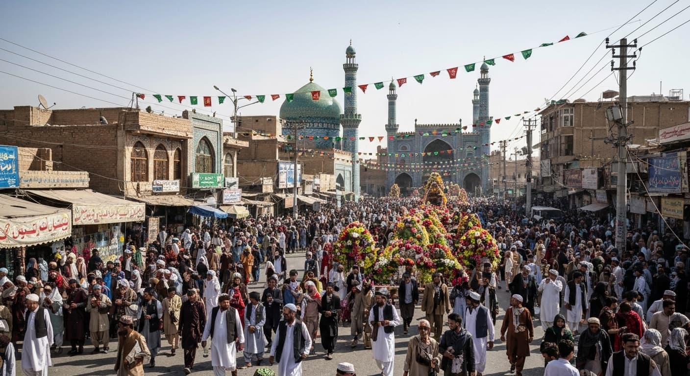 Mawlid celebration with mosque gatherings, Quran recitations, and communal prayers.